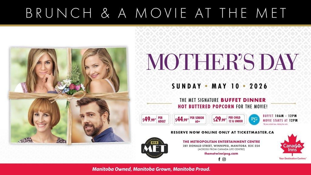 Celebrate Mother?s Day with a one-of-a-kind experience at The MET. Start your morning with our signature brunch buffet, available from 10:00 AM to 12:00 PM, featuring a curated selection of brunch favourites. At 12:00 PM, enjoy a screening of Mother?s Day (2016) complete Date: Sunday, May 10th 2026 Location: The MET - 281 Donald Street Winnipeg MB R3C 5S4 Doors Open & Buffet: 10AM ? 12PM Movie Starts: 12pm Details: Guests can enjoy beverages from our stand-up bar throughout the event. Midway through the film, a 15-minute intermission includes coffee and dessert served directly to your table, creating a relaxed and elevated movie experience. Please note tables are communal seating, unless you buy the entire table. ** Please note all tables are communal seating, unless entire table is purchased. Ticket Prices: Adults: $49.99 Seniors (60+): $44.99 Children (12 & Under): $29.99 All prices include taxes, plus fees per person. Reserve your table now!