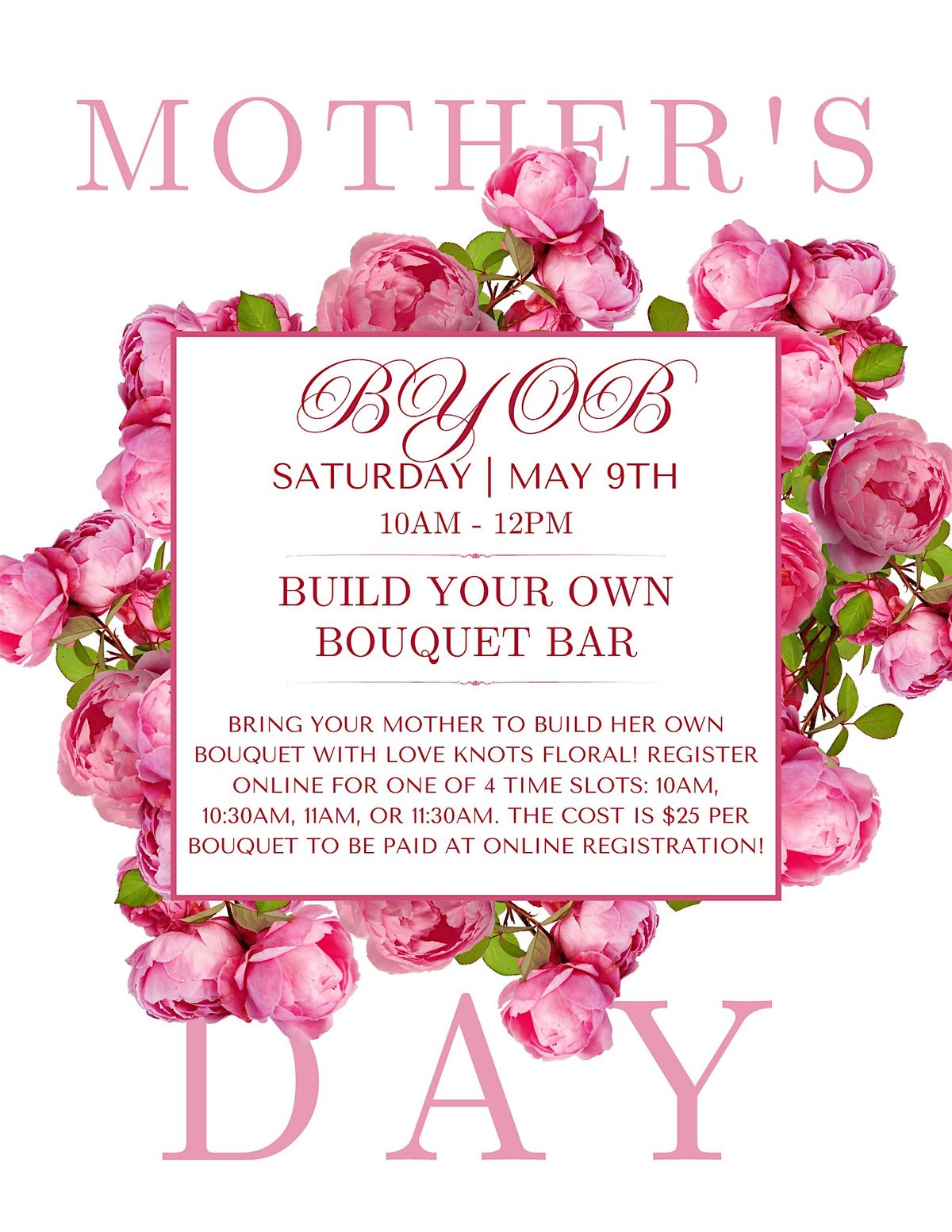 Join us and our neighbors from Love Knots Floral for a special Build Your Own Bouquet Bar, where you can create a custom, hand-picked bouquet just in time for Mother’s Day. Whether you're designing flowers for your mom, grandma, a special mentor, or yourself, this will be a fun and meaningful experience for all ages.