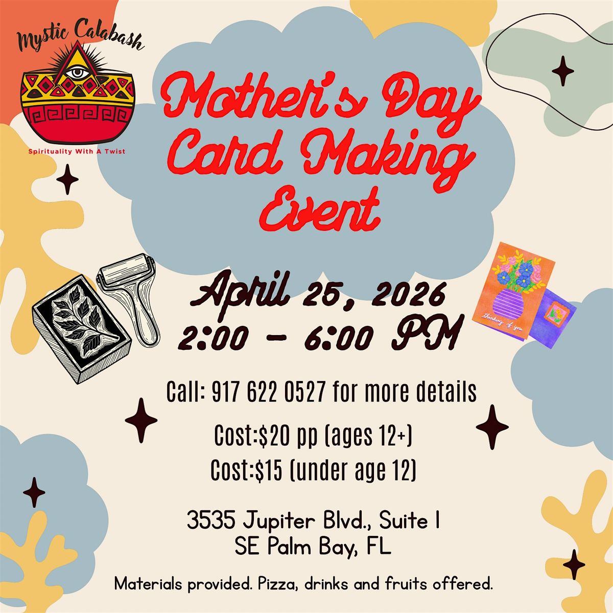 Venue is conviently located with ample parking. Material will be provided to make a simple and beautiful cards for mom. Pizza, beverages, and fruit will be available.