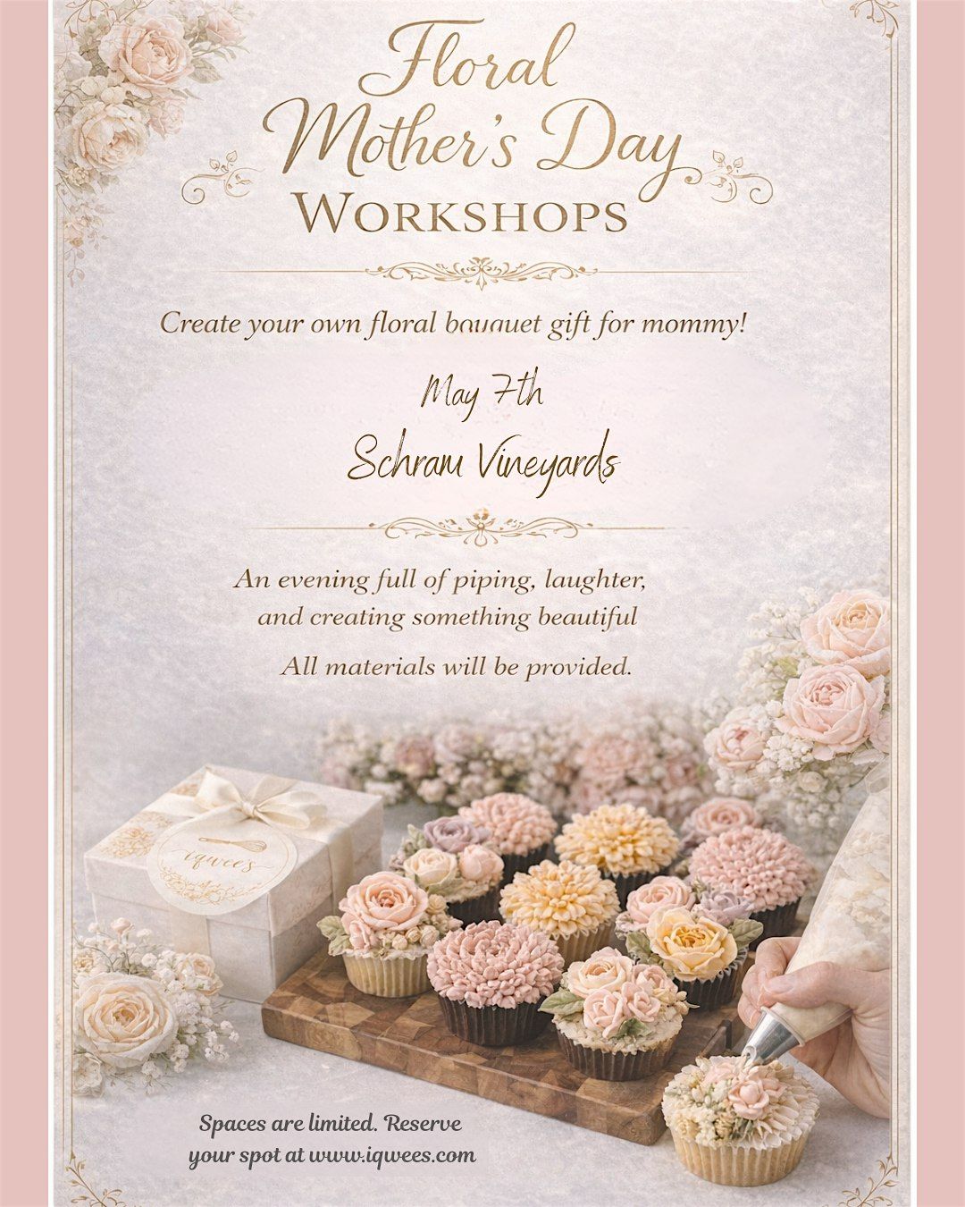 Join us for a relaxed and creative evening at Schram Vineyards as we design beautiful buttercream cupcake bouquets together.