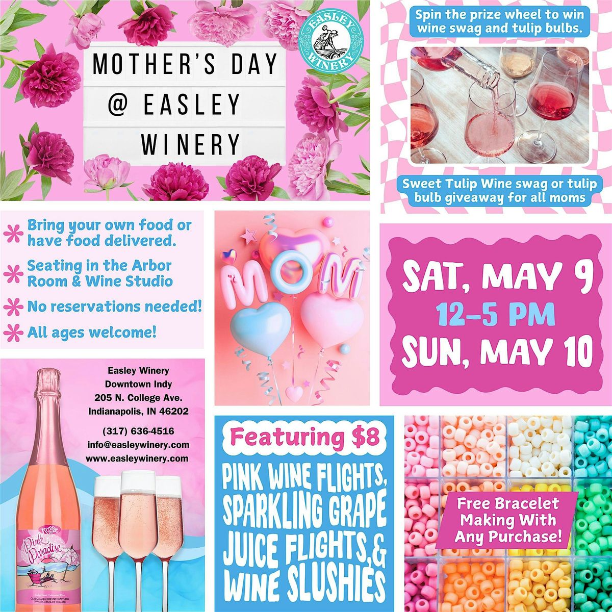 Featuring $8 Pink Wine Flights, Sparkling Grape Juice Flights, & Wine Slushies. All mother's get to spin the prize wheel for Sweet Tulip Swag. Free bracelet making with any purchase. Bring your own food or have it delivered. Indoor and outdoor seating in our wine garden (weather permitting). No reservations required. All ages welcome. Plenty of free onsite parking.