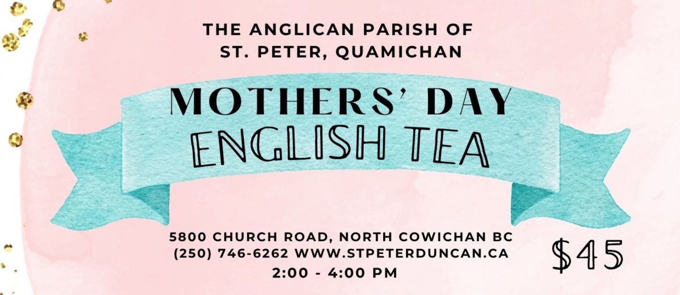 Celebrate Mothers' Day with an English Tea and live music at St. Peter's Church Hall on Saturday, May 9 from 2:00 to 4:00 PM. Tickets are $45 and available for puchase at the parish office (cash, cheque, debit or credit), by e-transfer to [email protected] (in the memo section add "Mothers' Day Tea"), or cash only at Ten Old Books at the Duncan Garage (330 Duncan St.).
