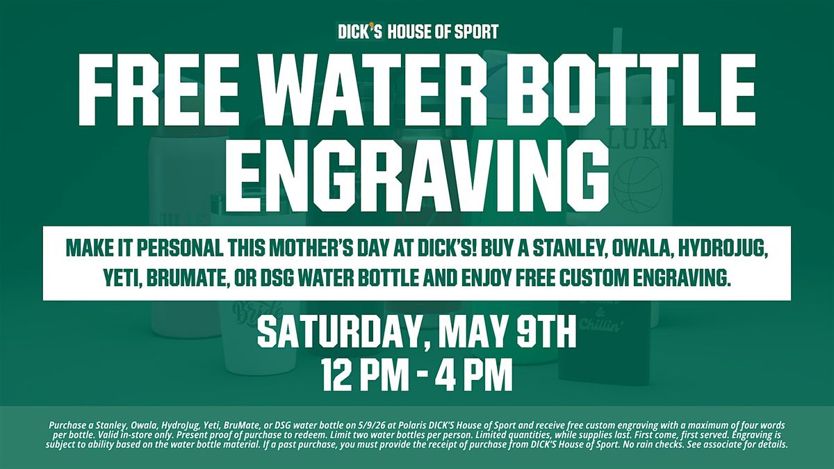 **Purchase a Stanley, Owala, HydroJug, Yeti, BruMate, or DSG water bottle on 05/09/26 at Polaris DICK’S House of Sport and receive free custom engraving with a maximum of four words per bottle. Valid in-store only. Present proof of purchase to redeem. Limit two water bottles per person. Limited quantities, while supplies last. First come, first served. Engraving is subject to ability based on the water bottle material. If a past purchase, you must provide the receipt of purchase from DICK’S House of Sport. No rain checks. See associate for details.