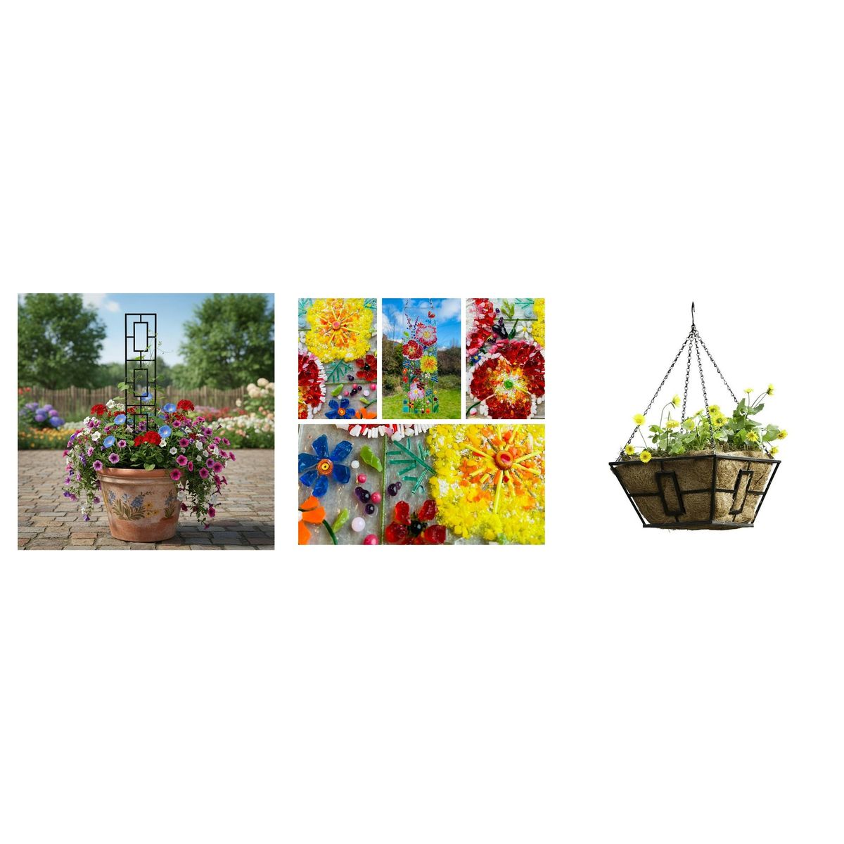 Create a pot trellis or hanging basket featuring three fused glass panels.