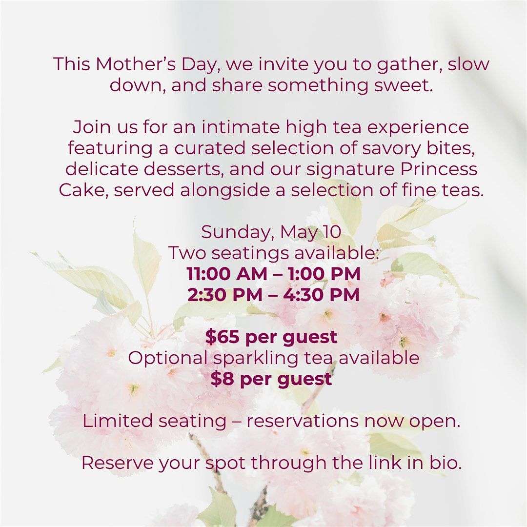 Join us for Mother's Day High Tea, an intimate in-person gathering where you can enjoy delightful teas, scrumptious bites, and lovely company. It's the perfect way to show Mom some love and make unforgettable memories together.