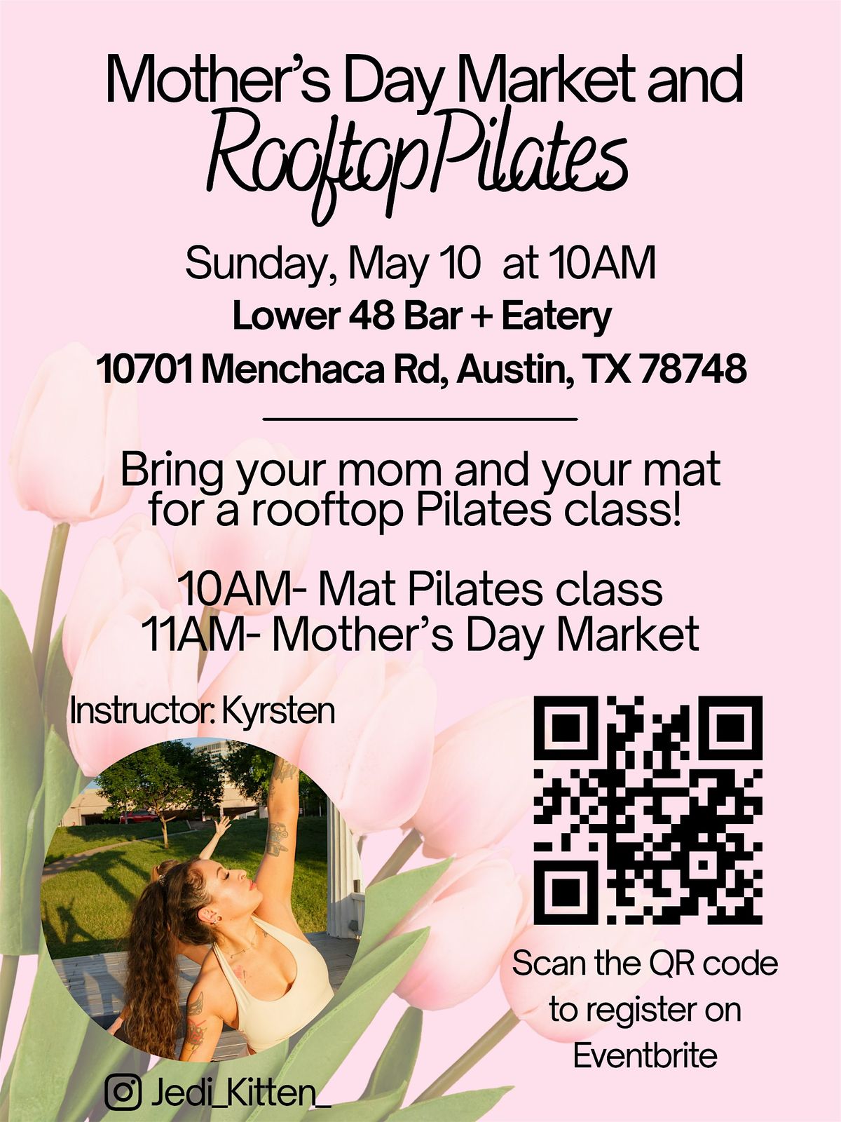 Join us for a fun in-person Mother's Day Market & Rooftop Pilates event! Find unique gifts and enjoy a refreshing Pilates session on the rooftop with amazing views. It's the perfect way to treat mom with some shopping and self-care vibes. Don't miss out on this special day full of smiles, fitness, and great finds!