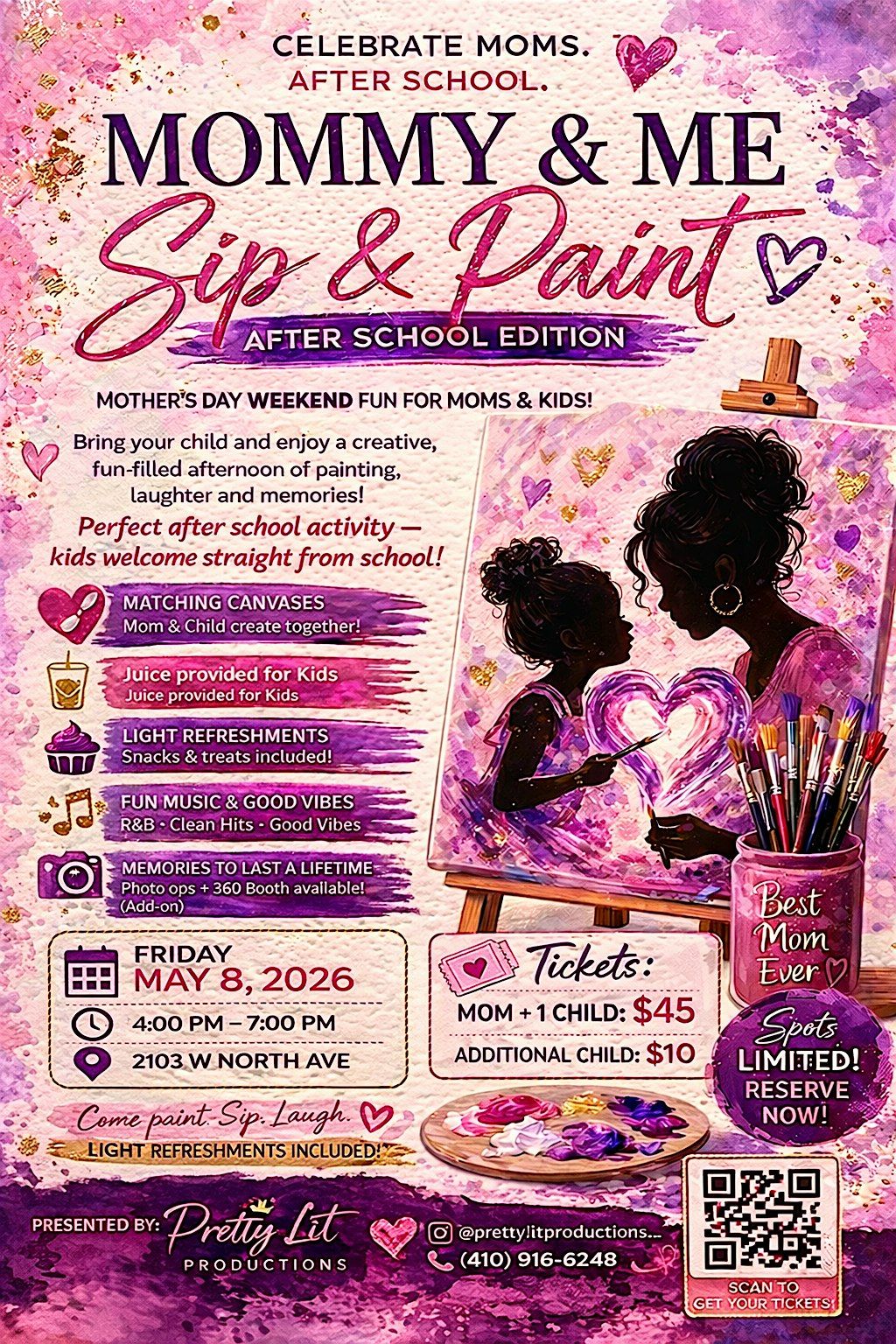 Join us for a fun, relaxing Mommy & Me Sip & Paint — the perfect after school activity to unwind, bond, and create memories together!