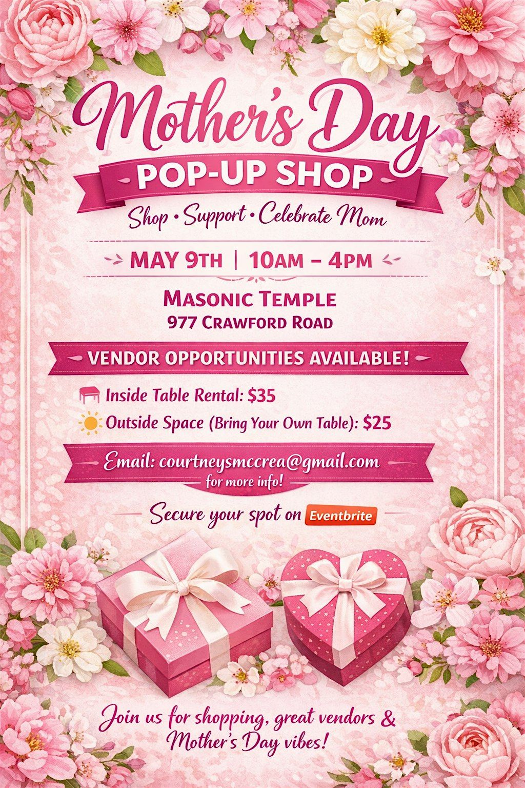 Get ready to treat Mom at our Mother's Day Pop Up Shop! Join us in person for a fun day filled with unique gifts, lovely surprises, and good vibes. It's the perfect spot to find something special that she'll adore. Don’t miss out on the chance to make this Mother’s Day extra memorable. Come hang out, shop local, and celebrate the amazing moms in your life!