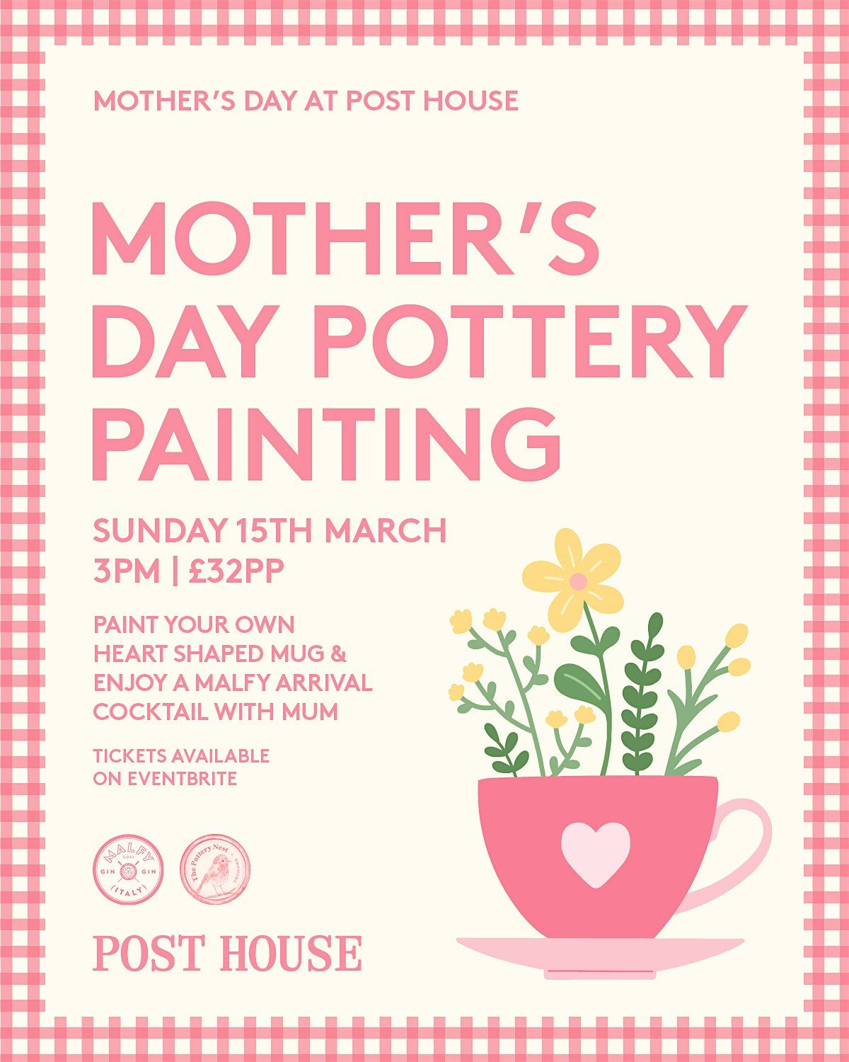 This Mother’s Day, join us in The Sorting Room for a cosy pottery painting session with The Pottery Nest. Create your own hand-thrown heart-shaped mug, enjoy an arrival Malfy cocktail, and spend some quality time together.