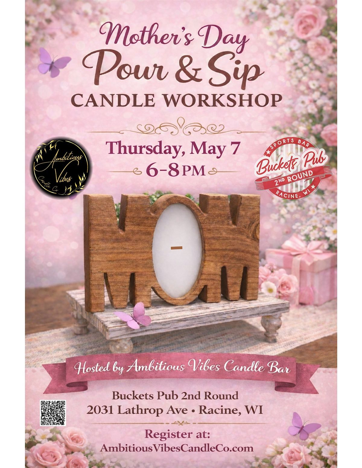 You’ll spend the evening together blending your own custom fragrance, pouring your candle into a beautiful wooden “MOM” vessel, and sharing conversations that turn into memories. While your candles set, enjoy a complimentary drink, and soak in the fun atmosphere of Buckets Pub 2nd Round.