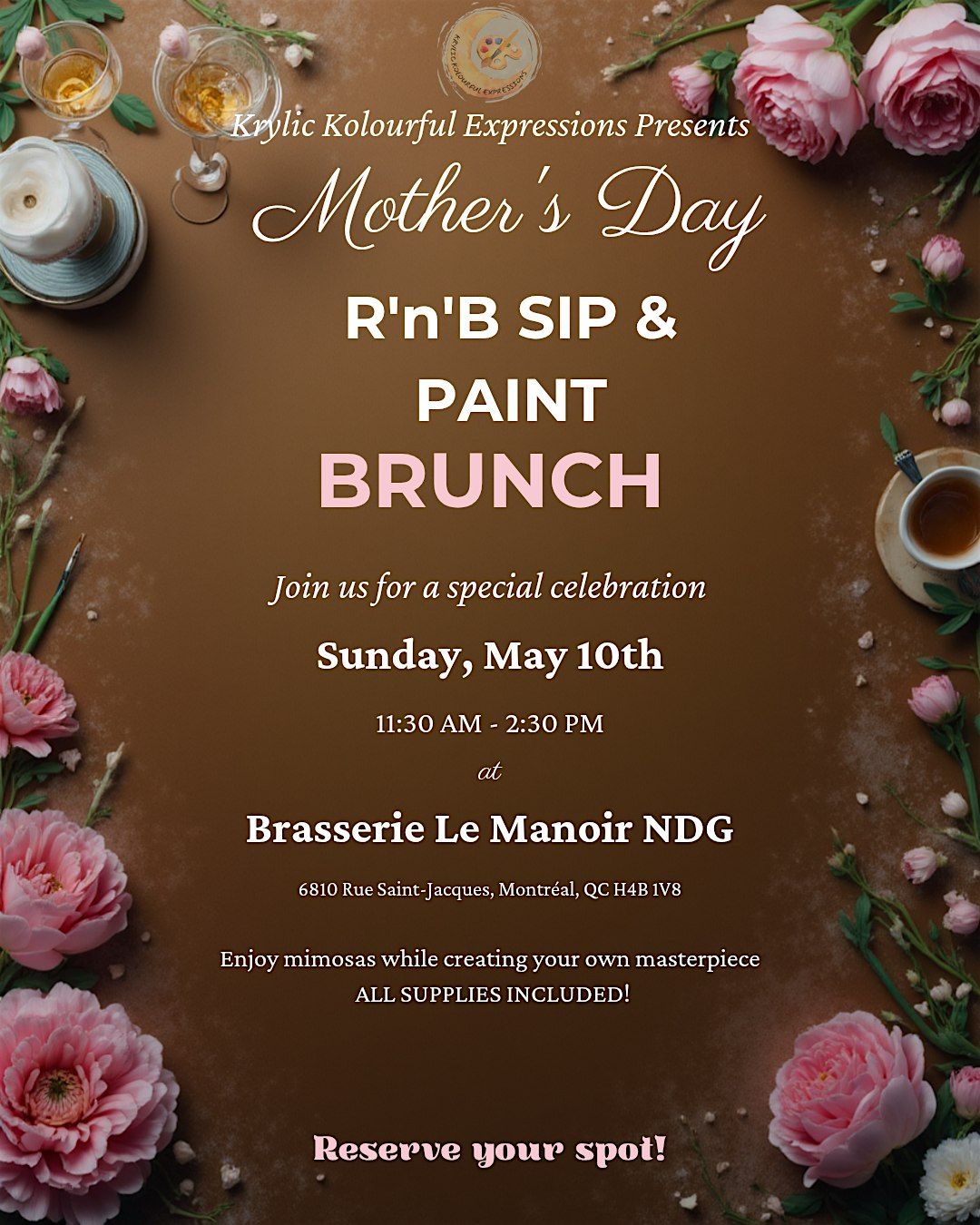 Join us on Sunday, May 10th at Brasserie Manoir NDG for an unforgettable evening of creativity,laughter, connection, and relaxation and GOOD music and GOOD vibes !!Whether you’re coming solo for some well-deserved “me time” or bringing along a mother who means the world to you, this is your moment to unwind, sip, laugh, and create something meaningful 🥂💕