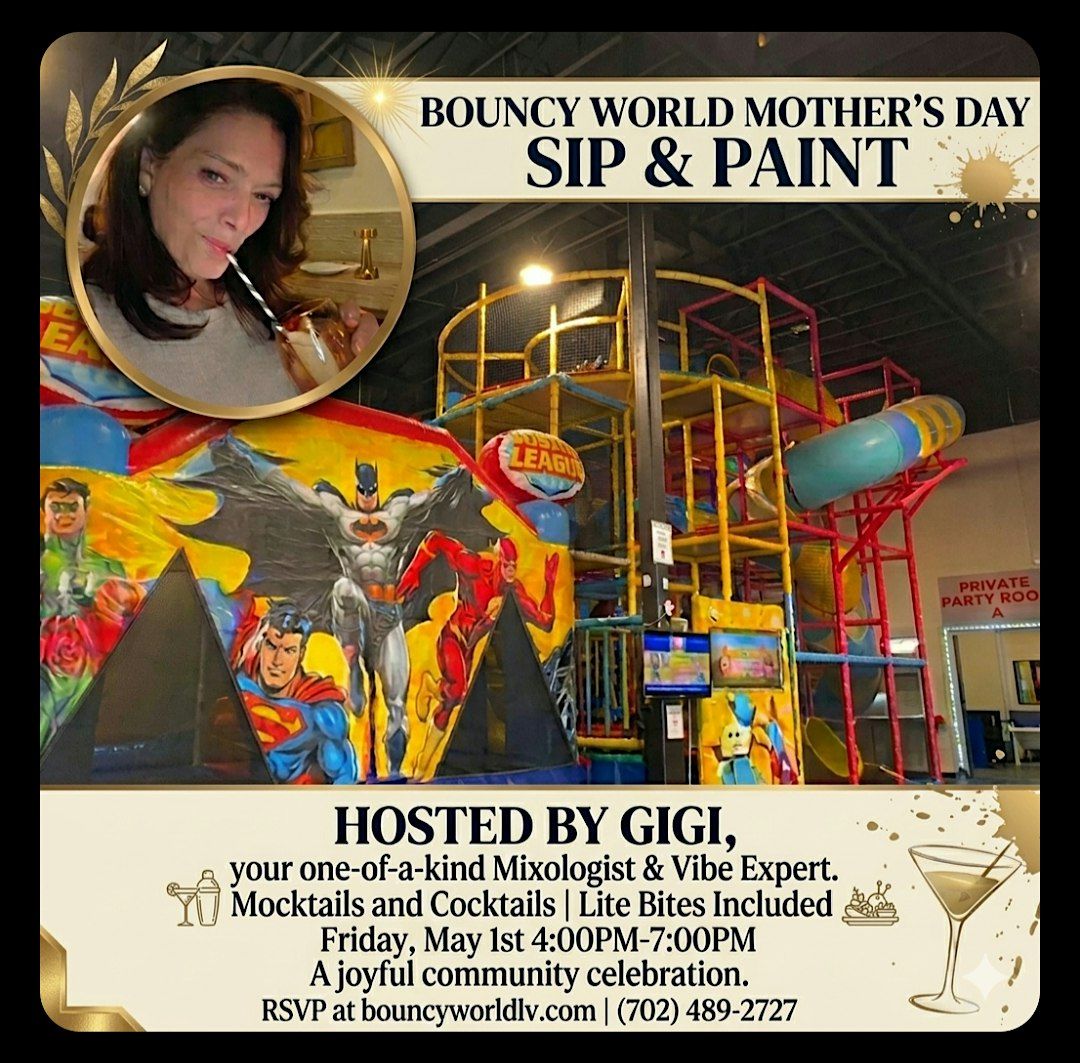 Join us in person for a super fun way to celebrate Mother's Day! Sip awesome drinks while getting creative with paint at Bouncy World. It's the perfect combo of relaxing, laughing, and making memories with Mom. No art skills needed—just bring your smile and get ready to have a blast!