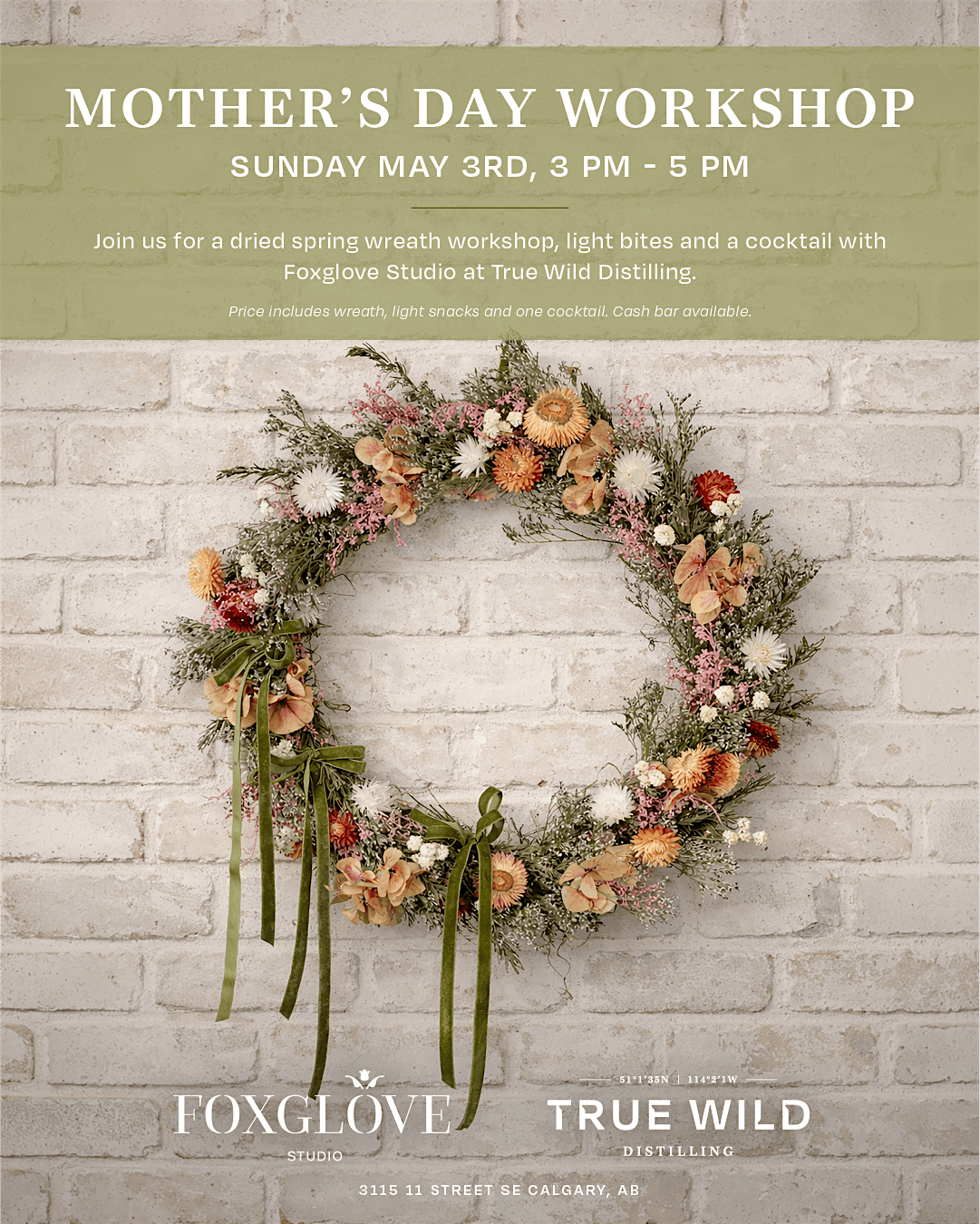 Join Foxglove Studio at True Wild Distilling for a special Mother's Day wreath making workshop, where you'll create a beautiful handcrafted wreath while enjoying cocktails and light bites in one of Calgary's oldest historic venues.