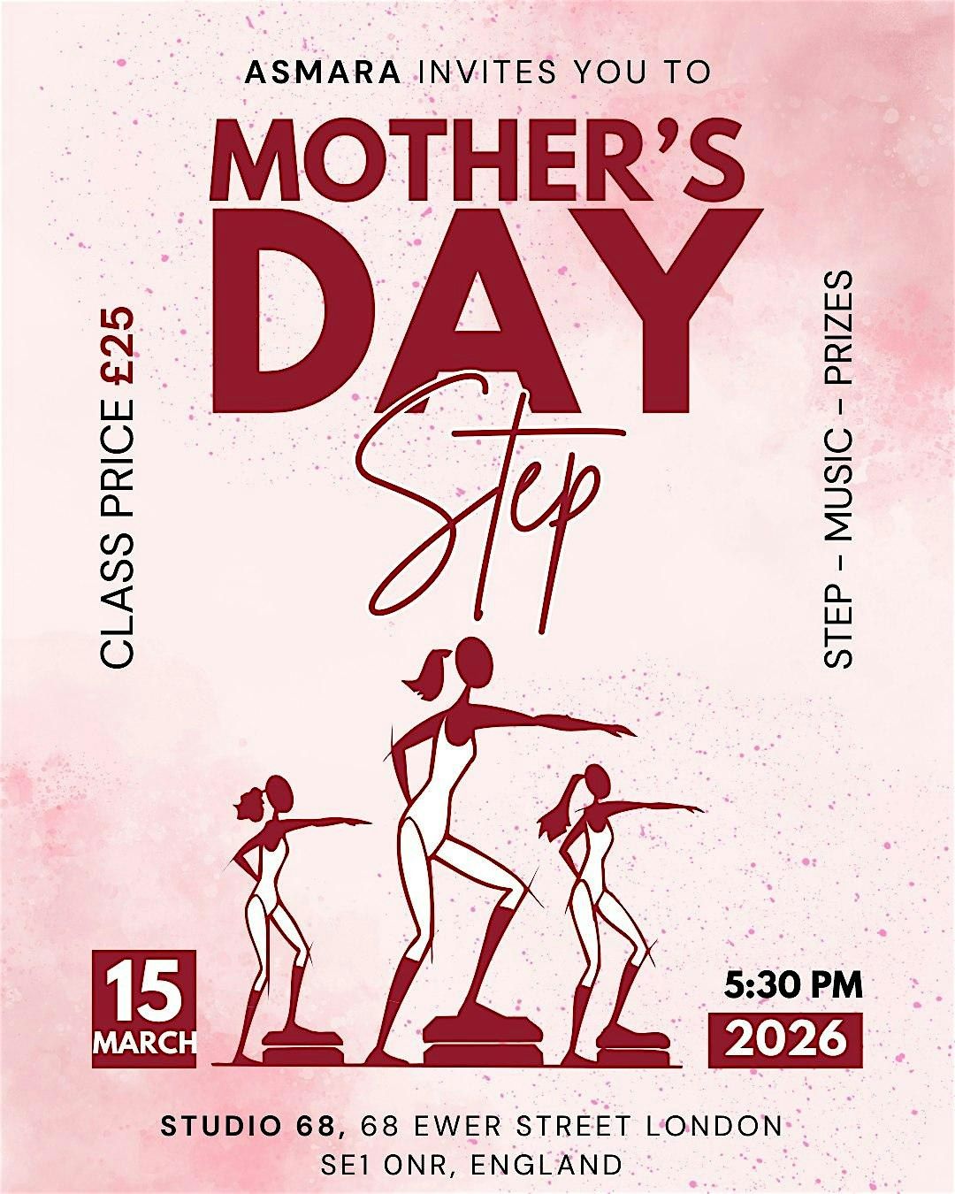 Join us for a fun and energetic Step Class to celebrate Mother's Day! It’s happening at Studio 68 London on March 15, 2026 at 5:30 PM (GMT). Whether you're stepping with mum or just want to enjoy a great workout, this class is perfect for all levels. Come ready to move, sweat, and have a blast in a friendly, relaxed atmosphere. Don't miss out on this awesome way to honor mums and get your heart pumping!
