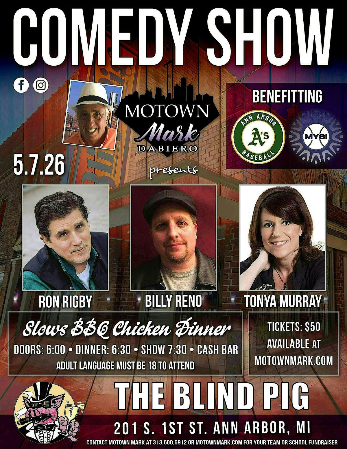 Get ready for a night full of laughs and good eats at The Blind Pig! Join Motown Mark, Ron Rigby, Billy Reno and Tonya Murray on May 7, 2026 at 6:00 PM for an unforgettable combo of comedy and Slow's BBQ Chicken dinner. It's the perfect way to kick back, enjoy some great jokes, and savor tasty food with friends. Don’t miss out on this fun in-person event right in the heart of Ann Arbor!