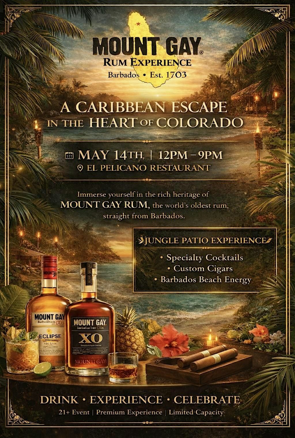 Caribbean vibes, premium Mount Gay Rum tastings, cigars, cocktails & live music—an immersive Barbados experience at El PelicanoAbout this Event