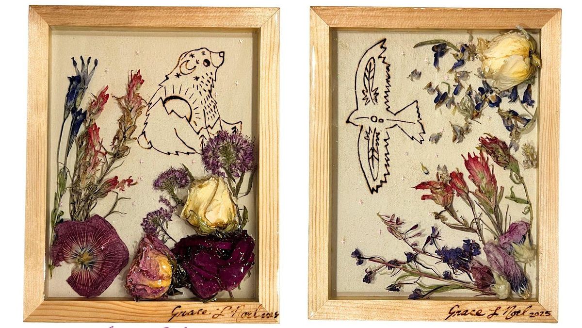 Grace's new series will feature innovative ways of combining unique materials inspired by the beauty of mother nature. These one of kind creations combine epoxy resin, oil paint, wood burning, and wild flowers grown in the Colorado Rocky Mountains.