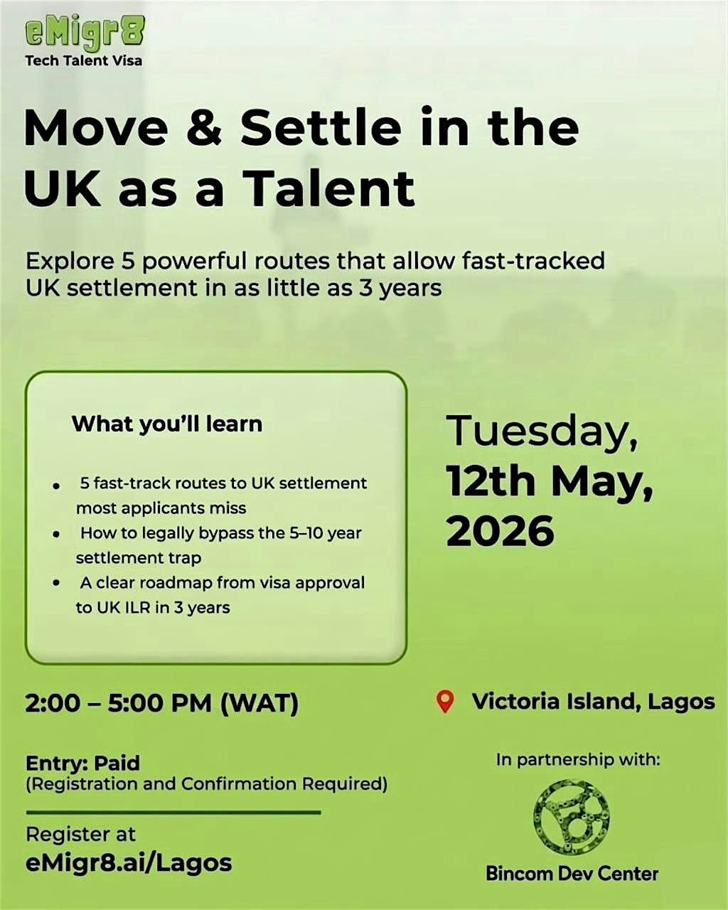 eMigr8.ai, in partnership with Bincom Dev Center, presents an exclusive, high-impact masterclass in Victoria Island, Lagos. This session is designed for professionals who refuse to be stuck in the "standard" 5-to-10-year settlement trap.