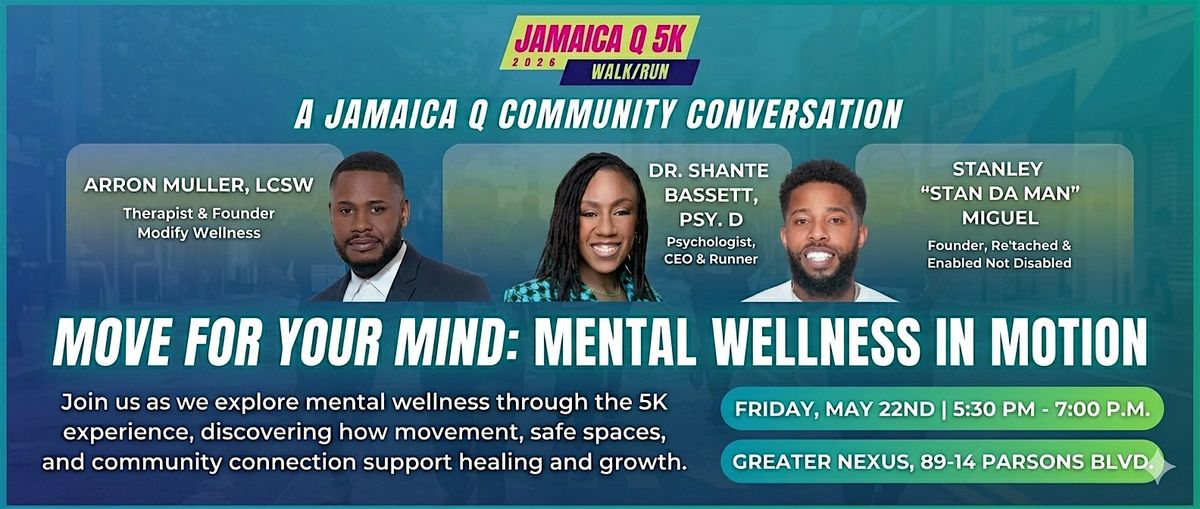 Kick off your journey on the road to the Jamaica Q 5K with this inspiring event! In recognition of Mental Health Month, this session explores the powerful connection between movement, mental wellness, and community support, because caring for your mind is just as important as caring for your body.