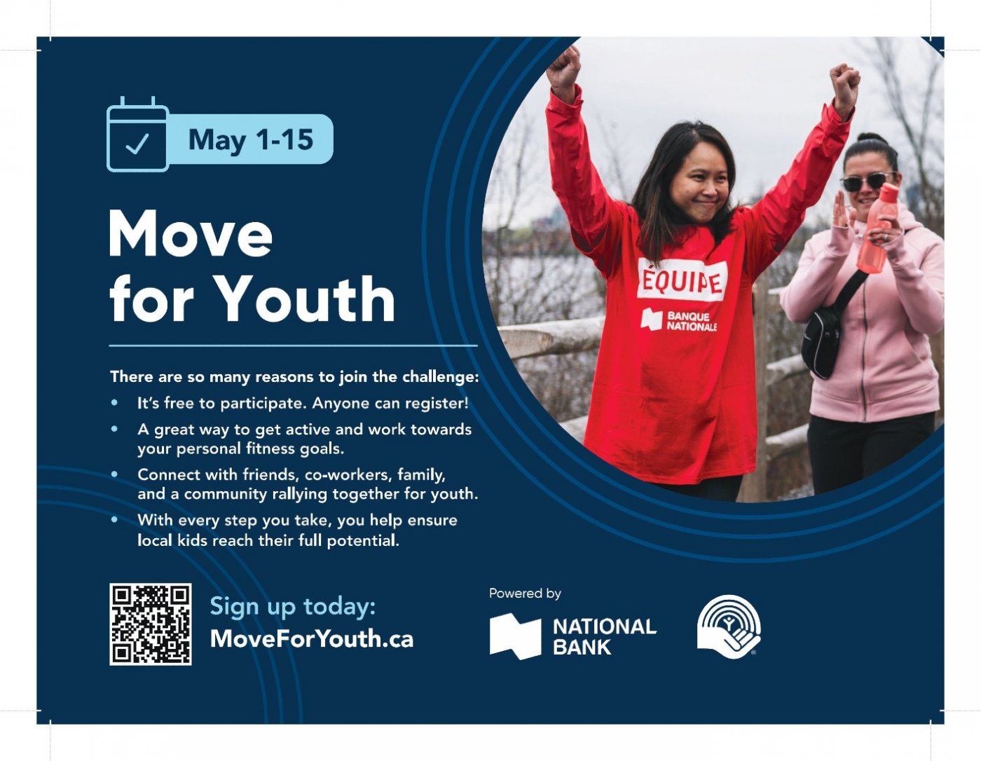 Move for Youth is a free activity challenge with a goal to reach 1,500 participants, 75,000 kilometers, 150 million total steps, and $150,000 dollars! Every step you take creates opportunities for local kids to thrive.