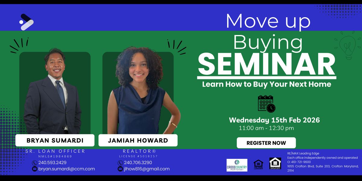This seminar is designed for current homeowners who want to better understand the move-up buying process, including how to sell their existing home while purchasing their next one without being displaced or carrying two mortgages at once.