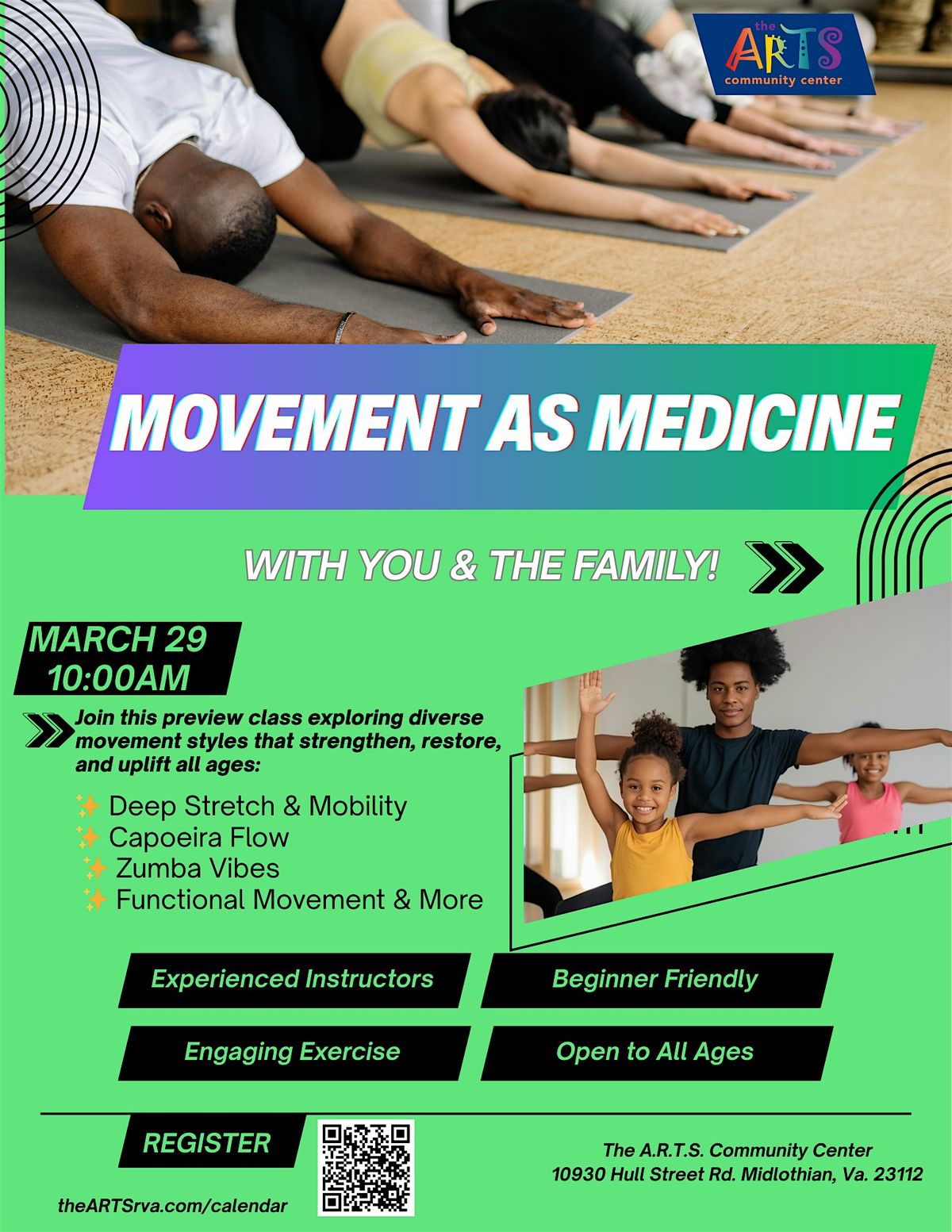 Join us at The A.R.T.S. Community Center for Movement as Medicine — an immersive, energetic preview experience designed to awaken your body and refresh your spirit. In this dynamic session, you’ll explore a powerful blend of movement styles including deep stretch and mobility, the rhythmic flow of capoeira, the feel-good vibes of Zumba, and other functional movement practices.