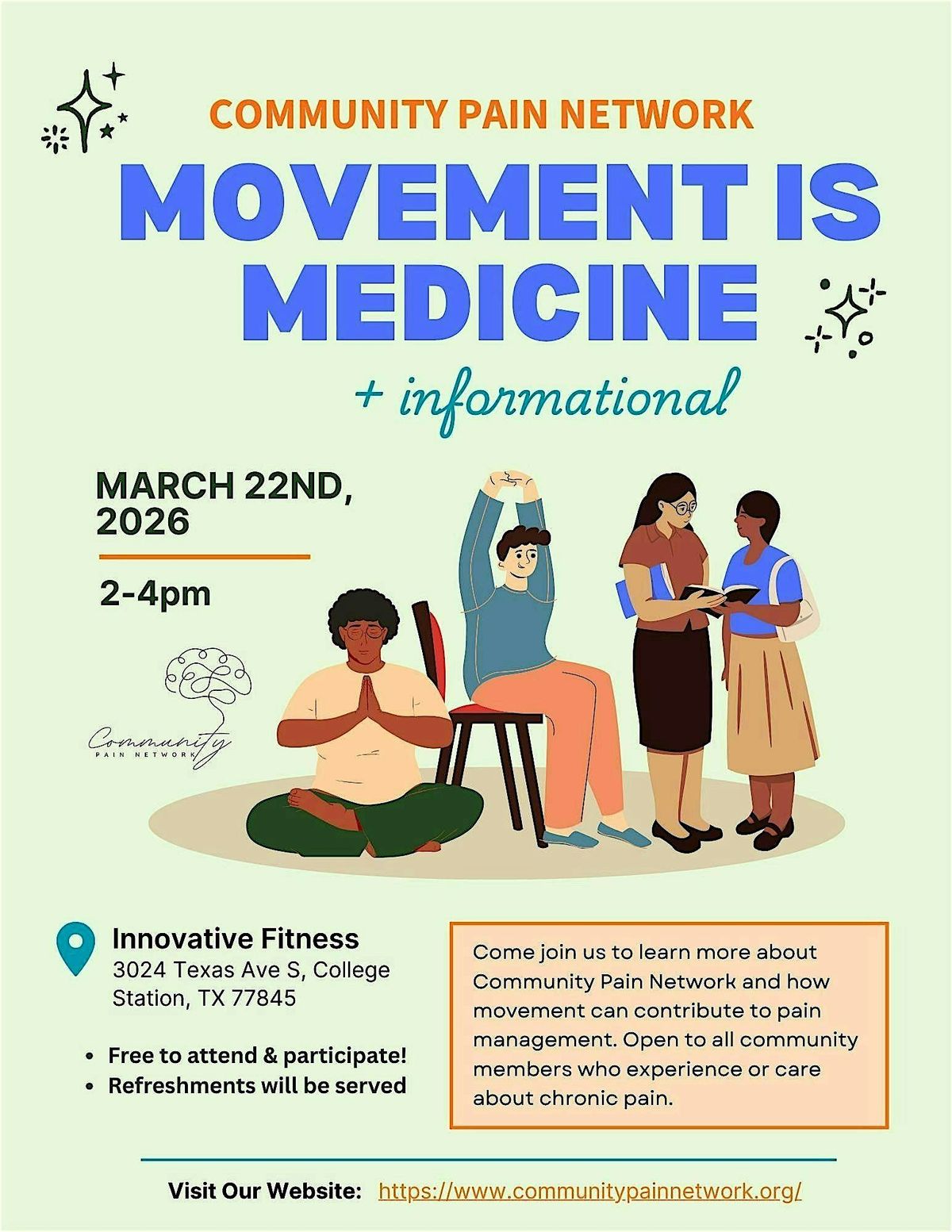 Come join us to learn more about Community Pain Network and how movement can contribute to pain management. Open to all community members who experience or care about chronic pain. Light refreshments will be served!