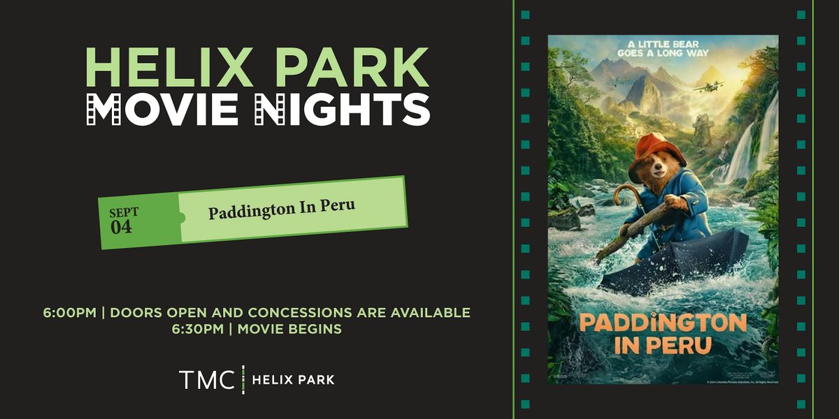 Join us in Helix Hall at the TMC3 Collaborative Building for a bear-y fun evening with Paddington in Peru, rated PG. Enjoy fresh popcorn and a variety of candies as Paddington embarks on a new adventure far from home on Friday, September 4, 2026. We ask that you please arrive 10-15 minutes early to find your seat before the movie starts.