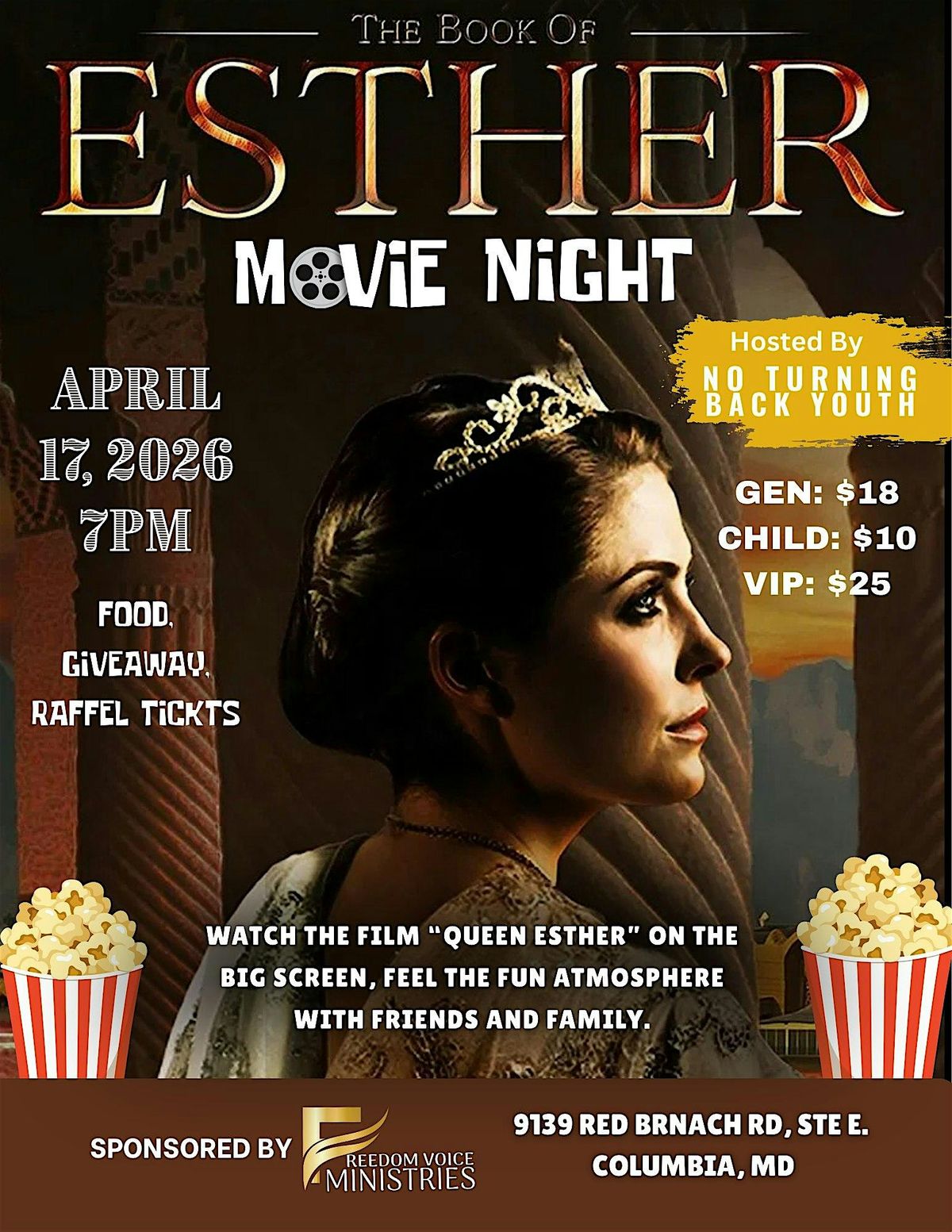 Queen Esther Movie Night! Apr 17, 7 PM at FVM. Hosted by No Turning Back Youth. All ages welcome! Food & Drinks sold. Get your tickets!About this Event
