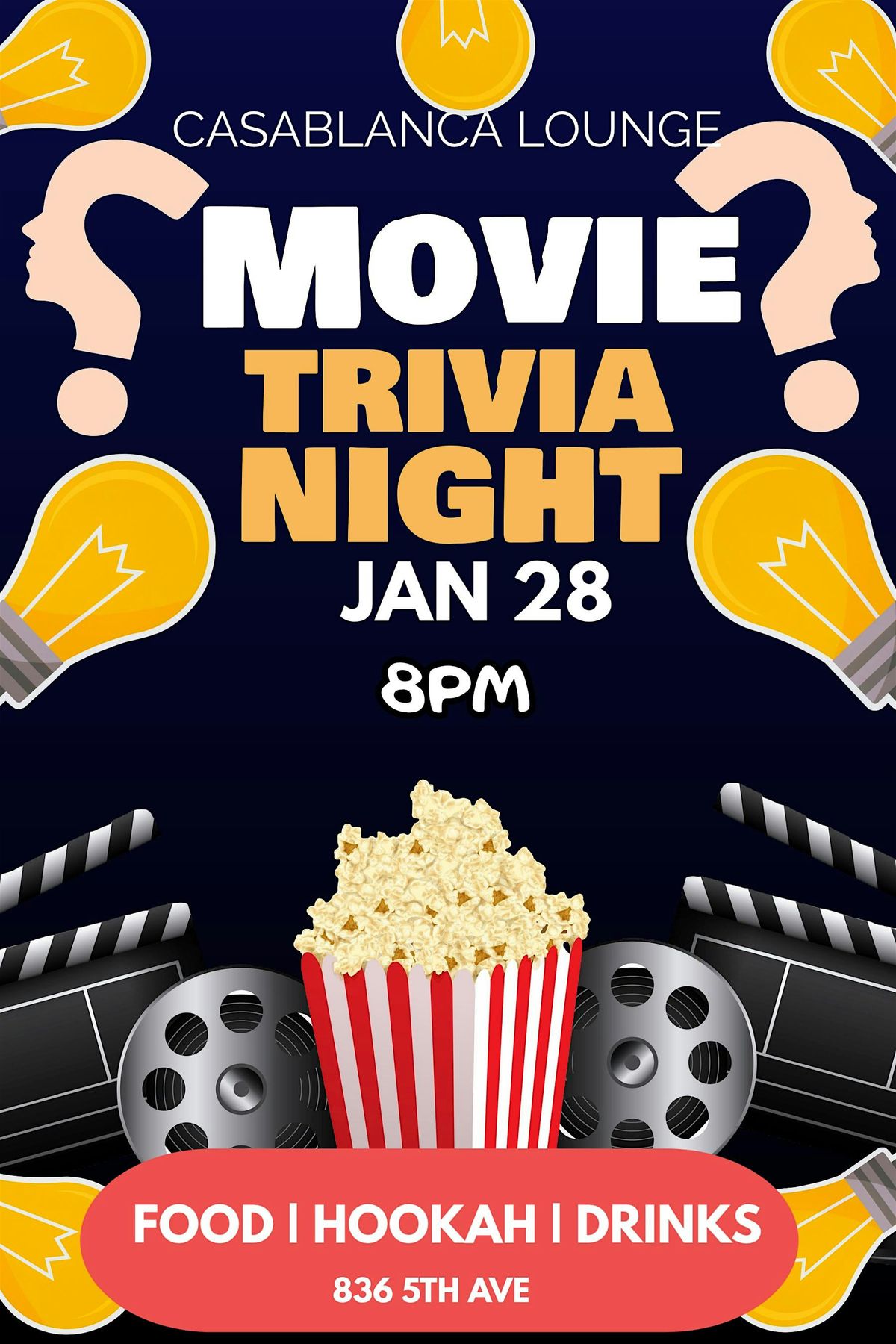 Get ready for a fun night where your movie knowledge takes center stage! Join us for an exciting evening filled with challenging questions, laughter, and good vibes. Whether you're a film buff or just love a good time, Movie Trivia Night is the perfect way to unwind and connect with fellow movie fans. Bring your friends, form a team, and let's see who knows the most about the silver screen!