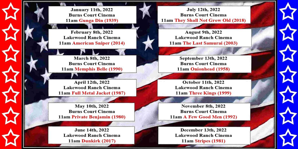 Sarasota Film Society is proud to present "Movies For Heroes", a year long Salute to our Military. Active, Non-Active, Retired Personnel & their family are welcomed to join us once a month at 11am at Burns Court & Lakewood Ranch Cinemas starting in January of 2022 for a year of free movie screenings. 10% of the concession sales from these screenings will go to Wounded Warrior Project. Space is limited, reserve your tickets today.