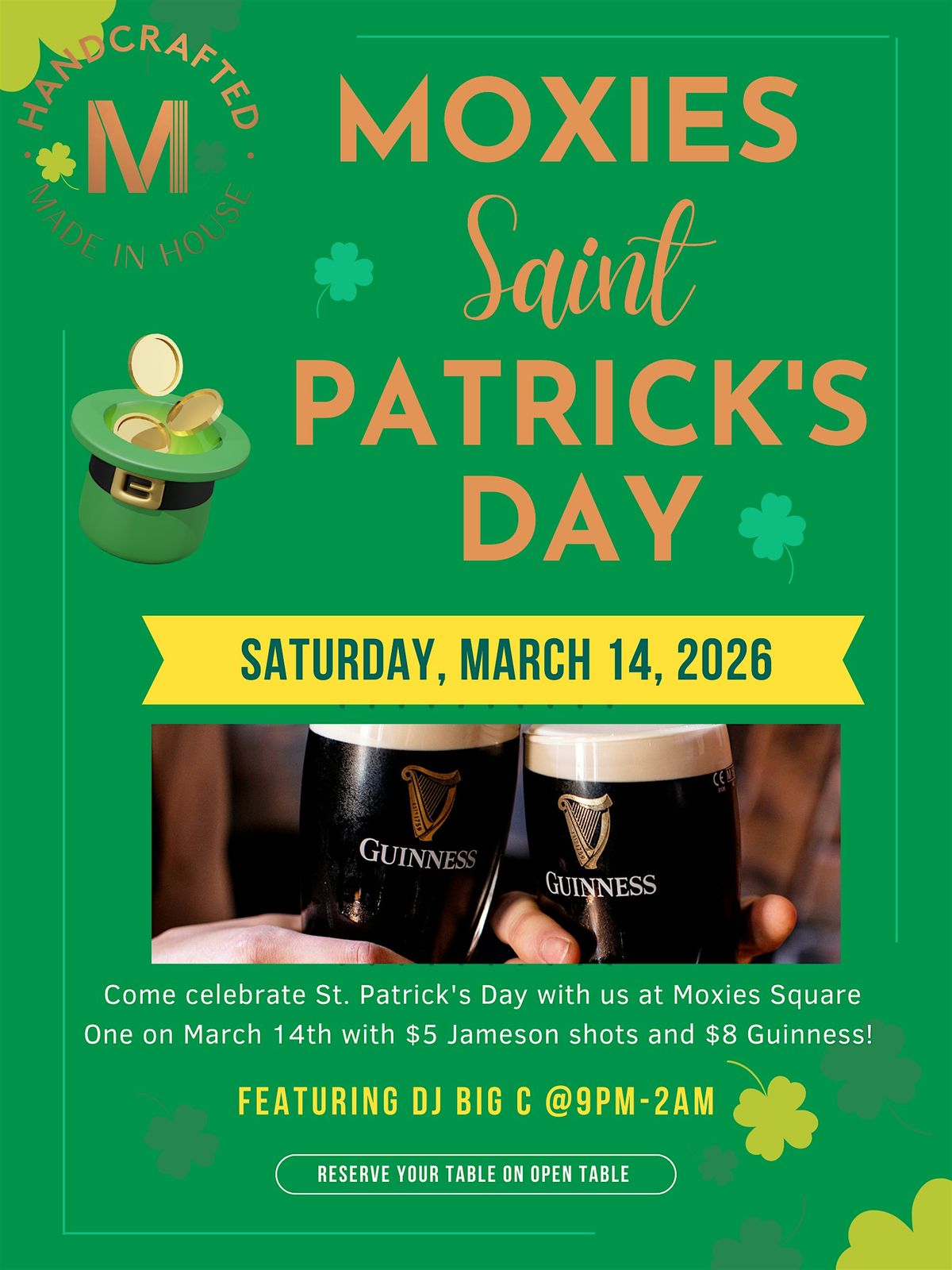 Come celebrate St. Patrick's Day with us at Moxies Square One on March 14th with $5 Jameson shots and $8 Guinness! FT. DJ BIG C!!