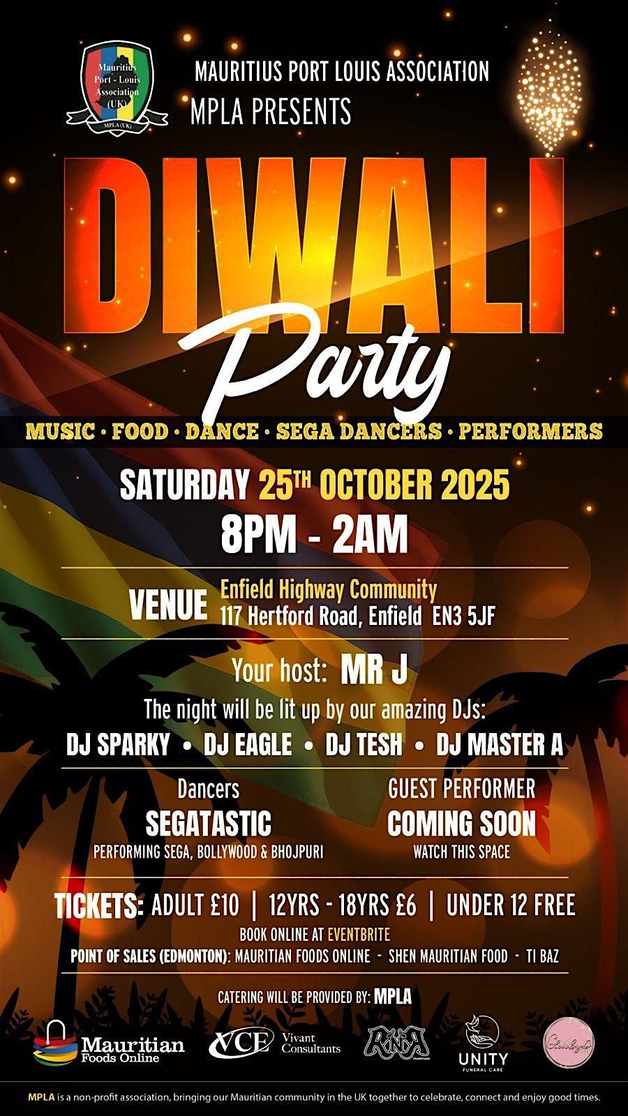 Welcome to the MPLA DIWALI FAMILY PARTY! Get ready to celebrate the festival of lights with your loved ones at our event. Join us on Sat Oct 25 2025 at 117 Hertford Rd, EN3 5JF for an evening filled with fun, food, and festivities.