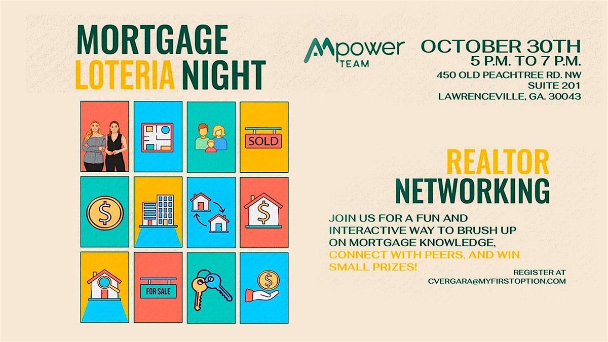 Come join us for a fun-filled night of Mortgage LOTERIA at our in-person event located at 450 Old Peachtree Rd NW suite 201. Get ready to meet other Real Estate professionals, win exciting prizes, and enjoy some friendly competition. Whether you're a LOTERIA pro or a newbie, this event will be enjoyable for everyone. Don't miss out on the chance to network, socialize, and have a blast playing LOTERIA with us!