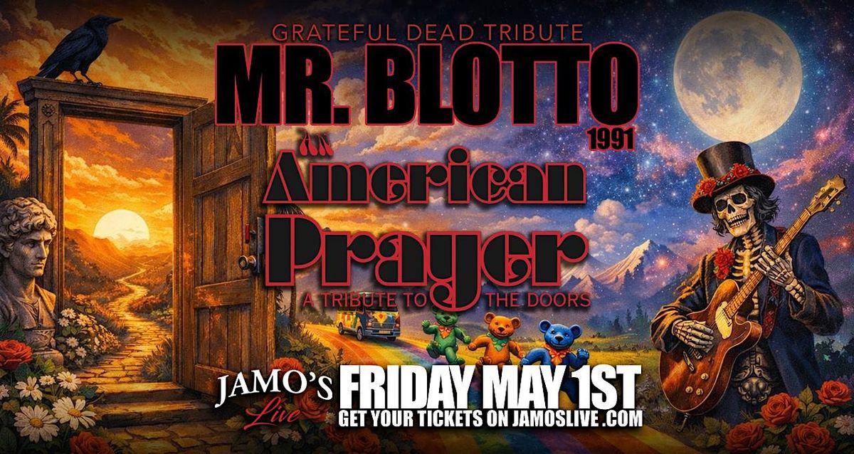 Get ready for an epic in-person jam session! Mr Blotto is teaming up with the Grateful Dead Tribute and American Prayer Doors Tribute for a night packed with classic vibes and live tunes. Join us at Jamo's Live for an unforgettable celebration of legendary sounds. Don’t miss out on these killer tributes all in one place – it’s gonna be a blast!