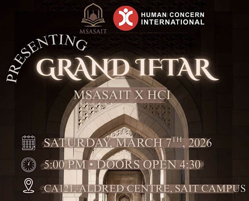 You are invited to the Grand Iftar on Saturday, March 7 at Aldred Centre, SAIT Campus. Doors open at 4:15 PM, and registration is mandatory, tickets will be checked at the door. No drop ins. Join us for an evening of community, inspiration, and a delicious iftar as we welcome special guest speakers. We look forward to seeing you there!