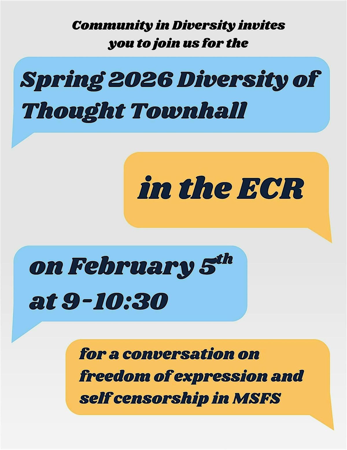 Please join the Community in Diversity Committee for a student-led and student only Diversity of Thought townhall in ICC 700