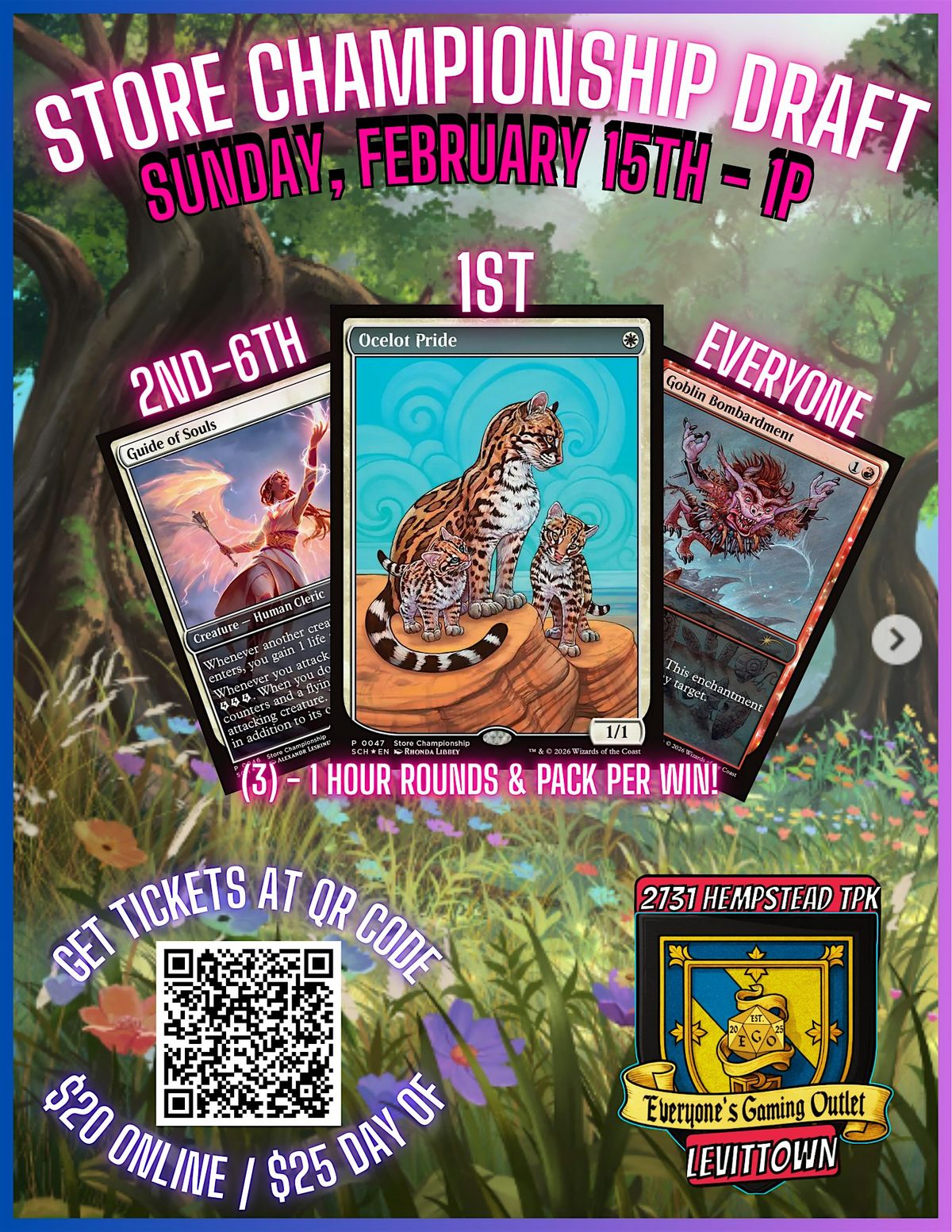 Hey folks we're hosting a Store Championship Draft with the top prize being a textless Ocelot Pride! Prize pack per win and a fun draft.About this Event