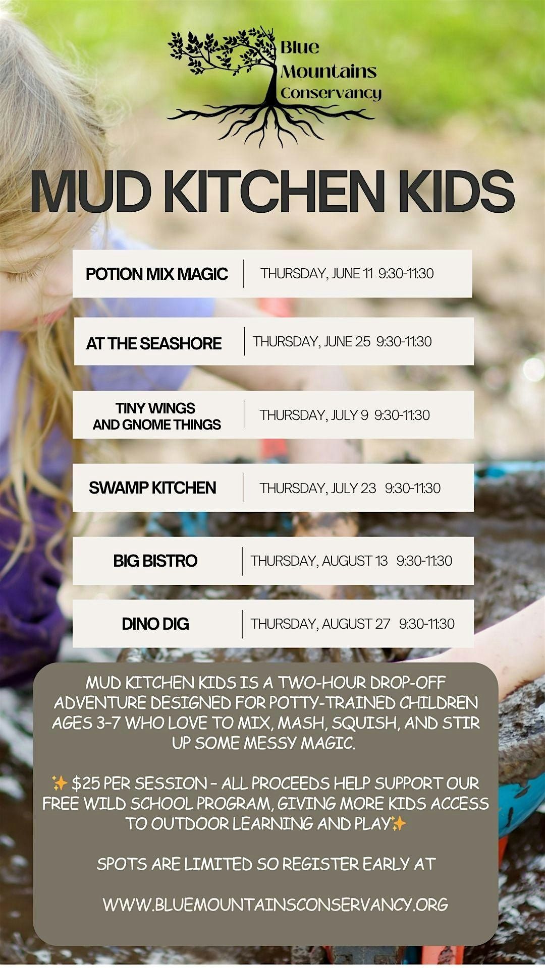 Calling all little chefs, explorers, and mud pie masters! Mud Kitchen Kids is a two-hour drop-off adventure designed for potty-trained children ages 3โ7 who love to mix, mash, squish, and stir up some messy magic. Each session invites kids to dive into our themed mud kitchen, where nature meets imagination and creativity runs wild!