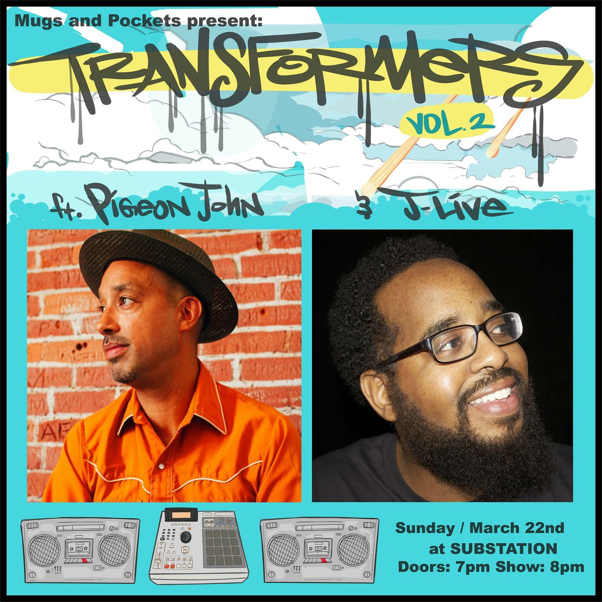 Transformers Vol 2 is the second installment of the Mugs and Pockets Transformers (live music) series, featuring a double headliner with Pigeon John and J-Live! Experience live hip hop, live art, and good people.