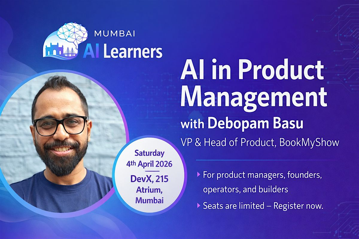 Join Mumbai AI Learners for an in-person session with Debopam Basu, VP & Head of Product Management at BookMyShow, as he shares a practical perspective on AI in Product Management. Debopam will cover how product managers are using AI across research, prioritization, execution, customer understanding, and decision-making, along with a few examples of how BookMyShow is thinking about and using AI.