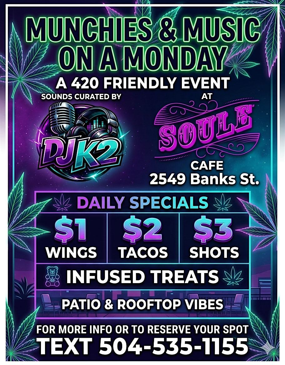 Join us for a chill 420 friendly vibe where good food meets great tunes! This in-person hangout is all about relaxing, munching, and grooving to some awesome music. Whether you’re here to vibe or just chill, it’s the perfect way to kick back and start your week right. Don’t miss out on the fun – bring your friends and your love for music and munchies!