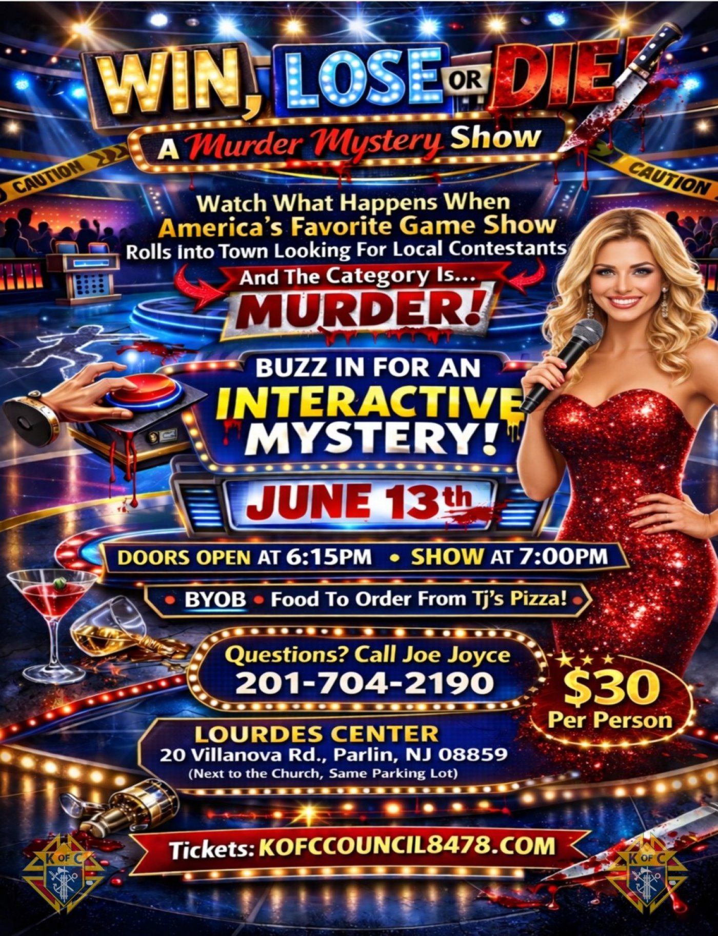 Join us on June 13th 2026 at St Bernadette Church at 7pm for a night of captivating storytelling and exciting revelations. As you step inside the immersive world of the murder mystery you'll find yourself surrounded by a cast of intriguing characters each with their own motives and secrets. It's up to you and your fellow guests to gather clues analyze evidence and ultimately unveil the identity of the cunning killer. Watch what happens when America’s favorite game show rolls into town looking for local contestants, and the category is murder! Everyone is in jeopardy, even the audience! Buzz in with your answer to the $64,000 question: who is the killer? Join us for this fast-paced, hysterically funny and light-hearted interactive mystery!