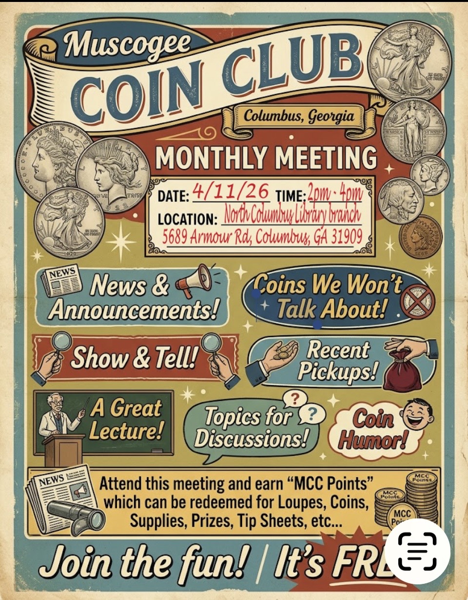 Indulge your love for coins and join us at the Muscogee Coin Club Monthly Meeting - where every coin has a story, and every story is waiting to be shared. Get ready for an unforgettable numismatic experience that will leave you inspired and eager for more.