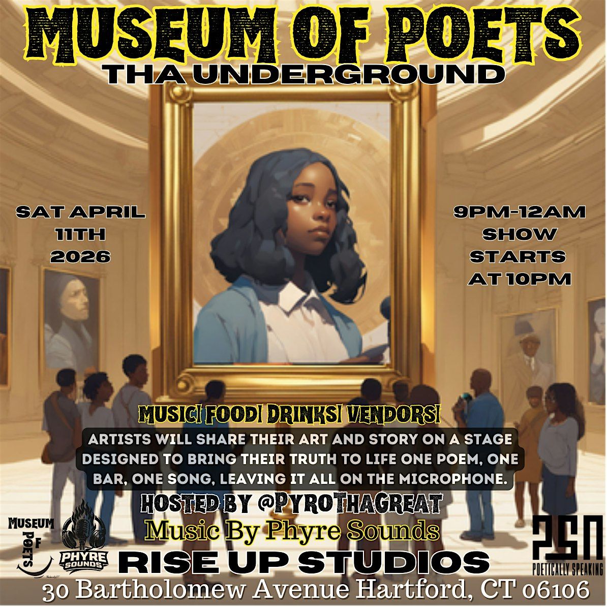 Come out to Museum Of Poets! THA UNDERGROUND! All Hosted By, Music By & Curated By Pyro Tha Great. Artists can lock in their free spot to perform by securing a performance ticket. Enjoy vendors, food and artistry in HARTFORD. See you soon