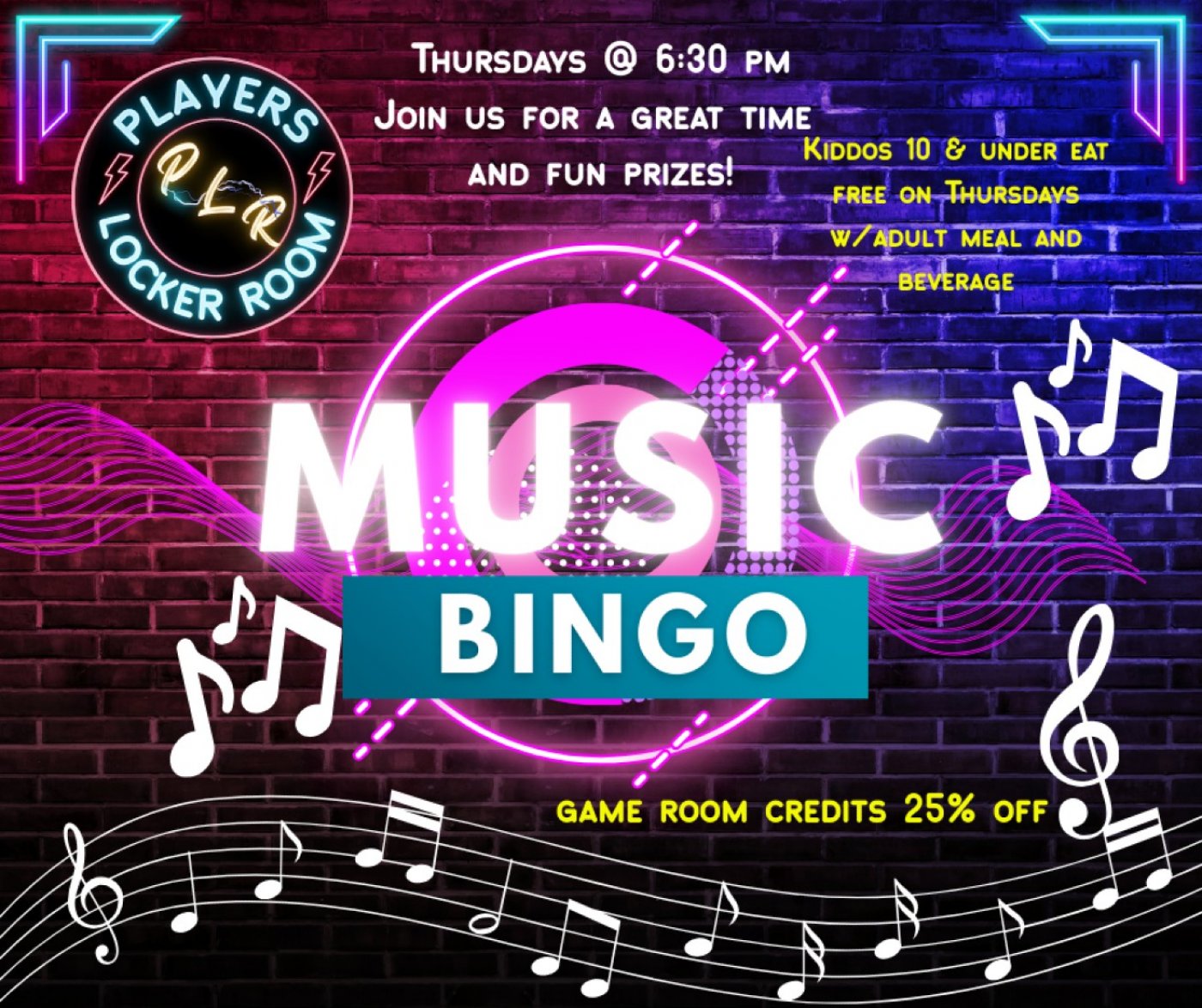 Get ready to tap your feet, test your music knowledge, and win amazing prizes at Players Locker Room's Music Bingo Night - where the music never stops and the fun is endless. Join us for a night to remember! ππΆ