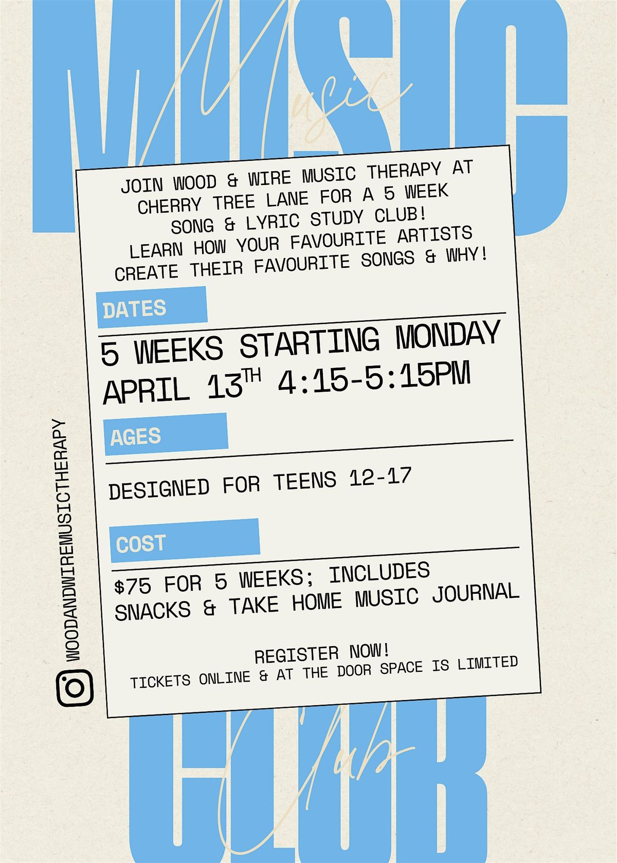 Cost: $75 per kiddo for all 5 weeks; cost includes snacks & a take home music journal