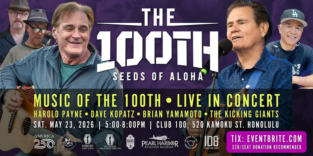 This event presents all original songs created for THE 100TH, Seeds of Aloha, a feature-length film on the famed WWII 100th/442nd RCT -- aka "The Purple Heart Batallion" -- one of the most decorated units in US military history. This is a rare opportunity to hear all of the filmʻs songs in their entirety. Performed by THE 100TH Music Directors, song writers and lead vocalists HAROLD PAYNE and DAVE KOPATZ. Also joined by lead vocalist BRIAN YAMAMOTO and THE KICKING GIANTS.