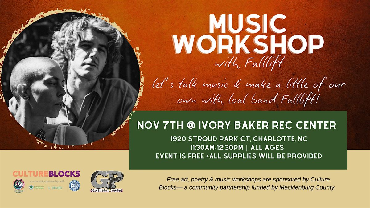 Get ready to learn emotional expression via song writing with the awesome local band to Charlotte Falllift! Whether you’re a newbie or a pro, this workshop is all about exploring basic songwriting techniques with a focus on connecting to our emotions and expressing them in a creative way.