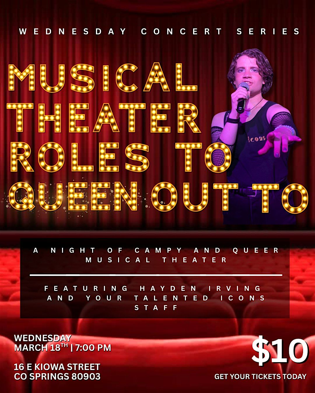 They say the neon lights are bright on Broadway, but the stars shine even brighter at your local queer bar in Colorado Springs! Your most be-glittered Icons bartender, Hayden Irving, armed with a BFA in Theatre Arts (and the student debt to match), presents an entire night of stage musical drama and delights! Enjoy a campy celebration of the musical canon with songs from Broadway classics like Oklahoma, Company, and Little Shop of Horrors, and deep-cut choice ballads written for women in their 40’s to belt through tears! Featuring Hayden and many other familiar Icons faces and voices, this night promises to be a gay ol’ time!